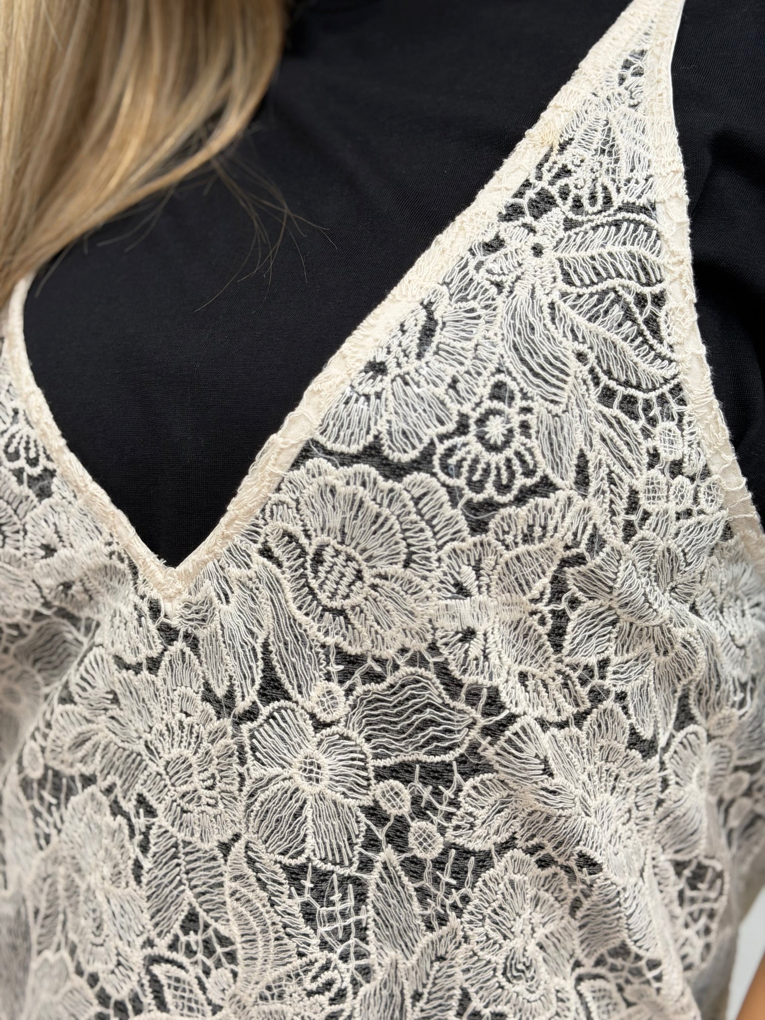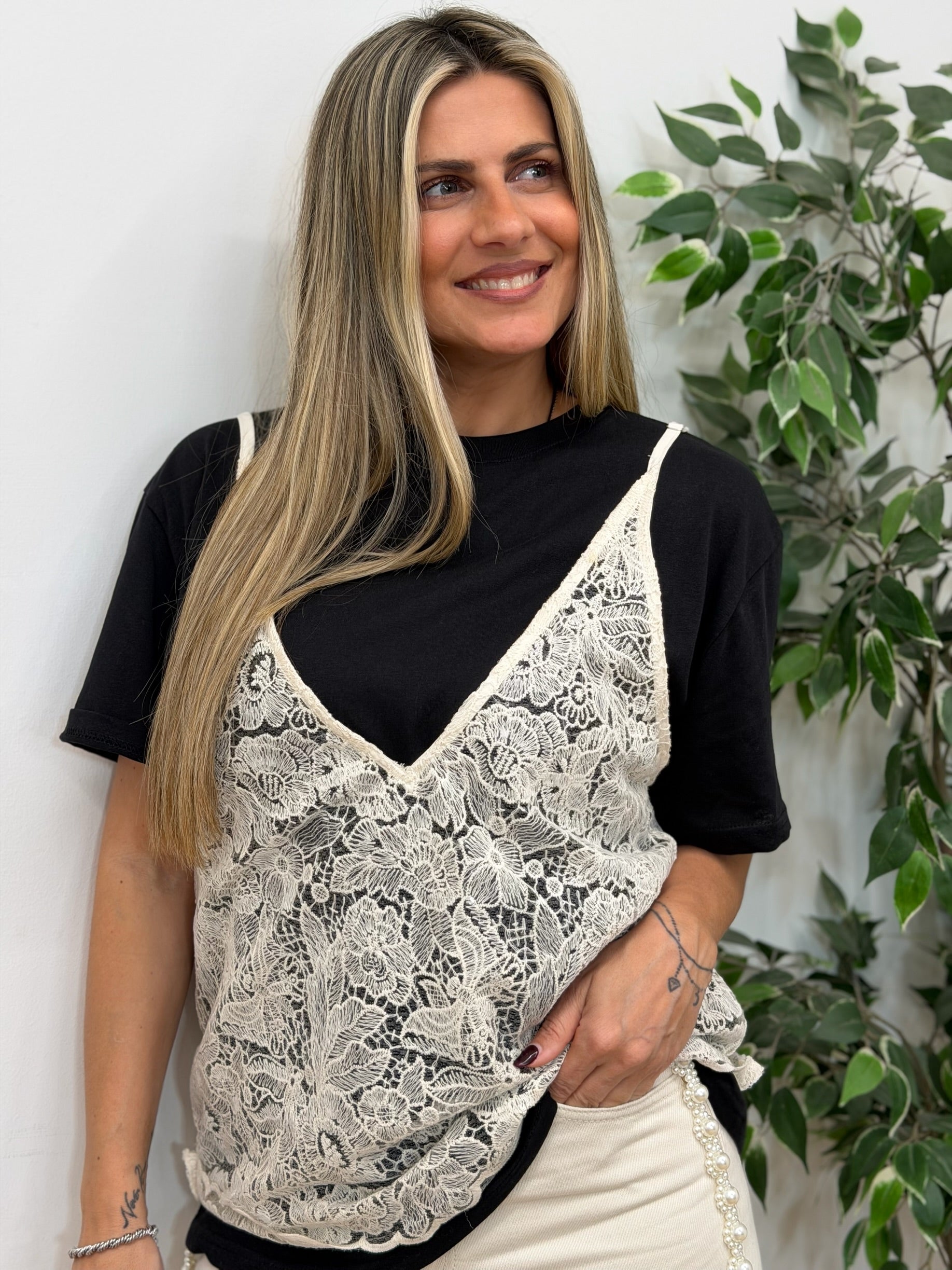 • Ένα κλασικό, άνετο μαύρο T-shirt από απαλό ύφασμα και ένα εντυπωσιακό διάφανο δαντελένιο top σε κρεμ απόχρωση.