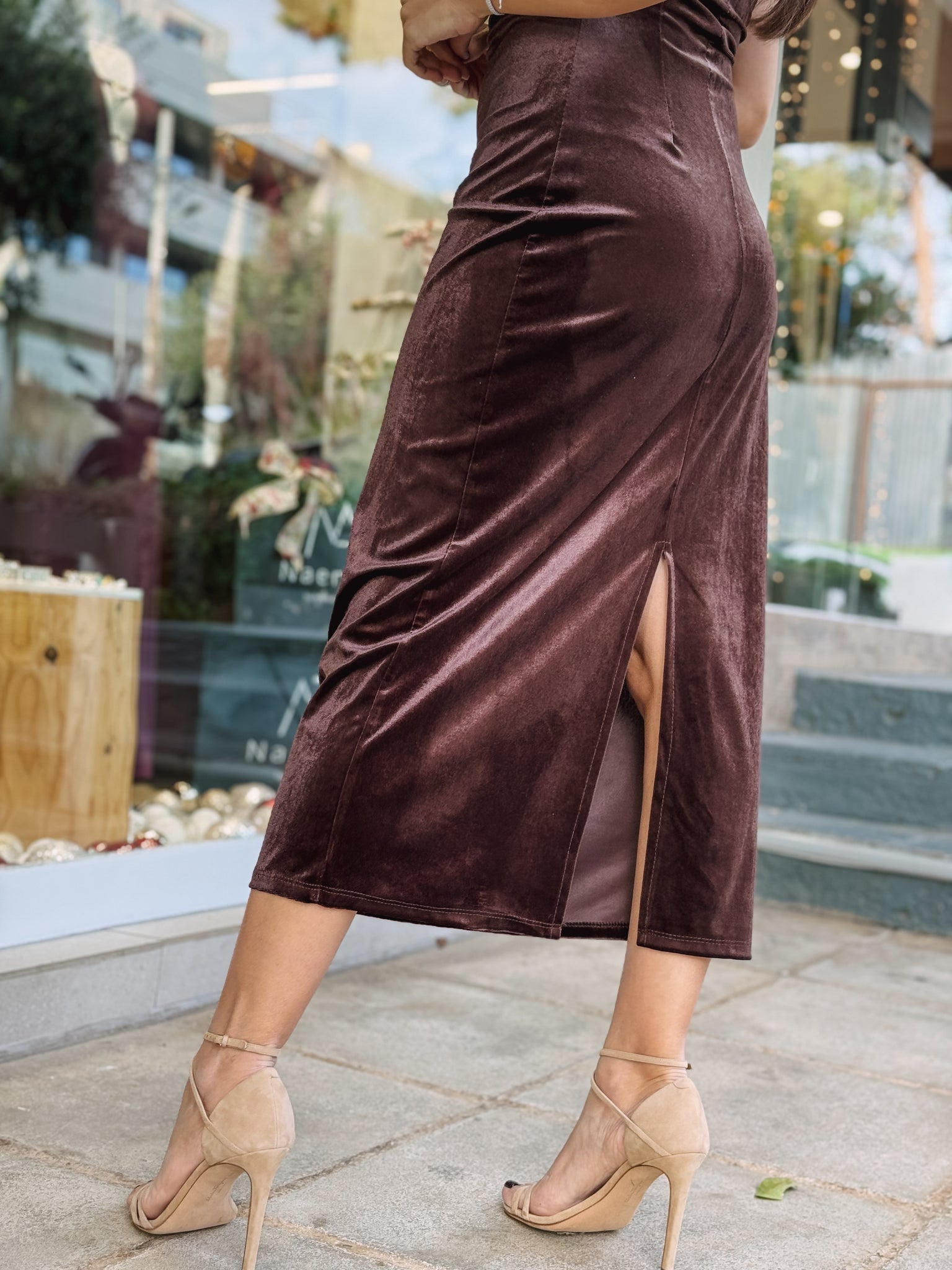 The Velour Muse Midi Dress is the dress that exudes femininity and discreet luxury. Made of soft velvet in a chocolate shade, it hugs the body and highlights the silhouette in the most elegant way.