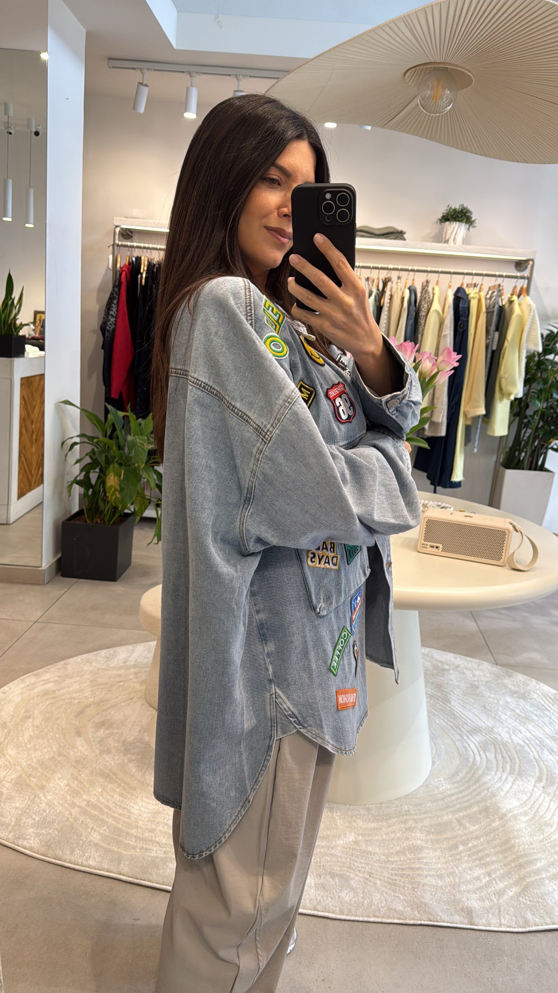 Ένα denim jacket που δεν περνά απαρατήρητο. Το συγκεκριμένο κομμάτι συνδυάζει το κλασικό light wash denim με εντυπωσιακά ραμμένα patches σε όλη την επιφάνεια, δημιουργώντας ένα playful αλλά απόλυτα σύγχρονο αποτέλεσμα.